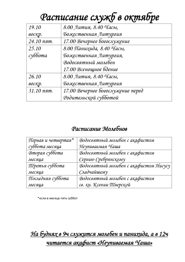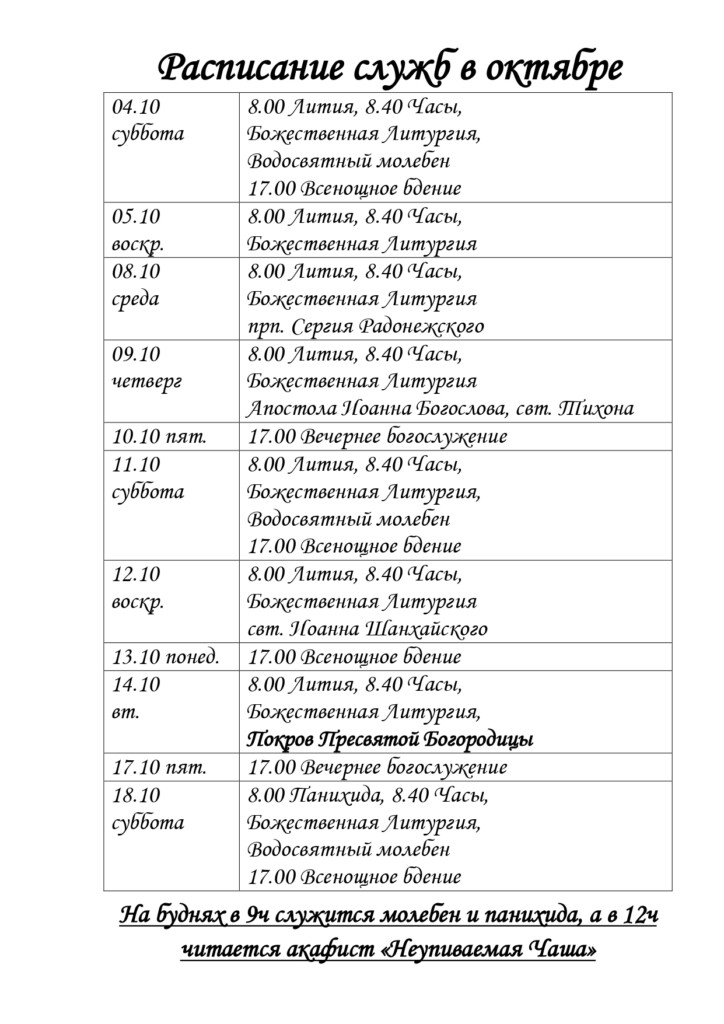 В храме ежедневно совершается: в 9 ч молебен и панихида, и в 12ч акафист перед иконой Богородицы «Неупиваемая Чаша» (по будням)